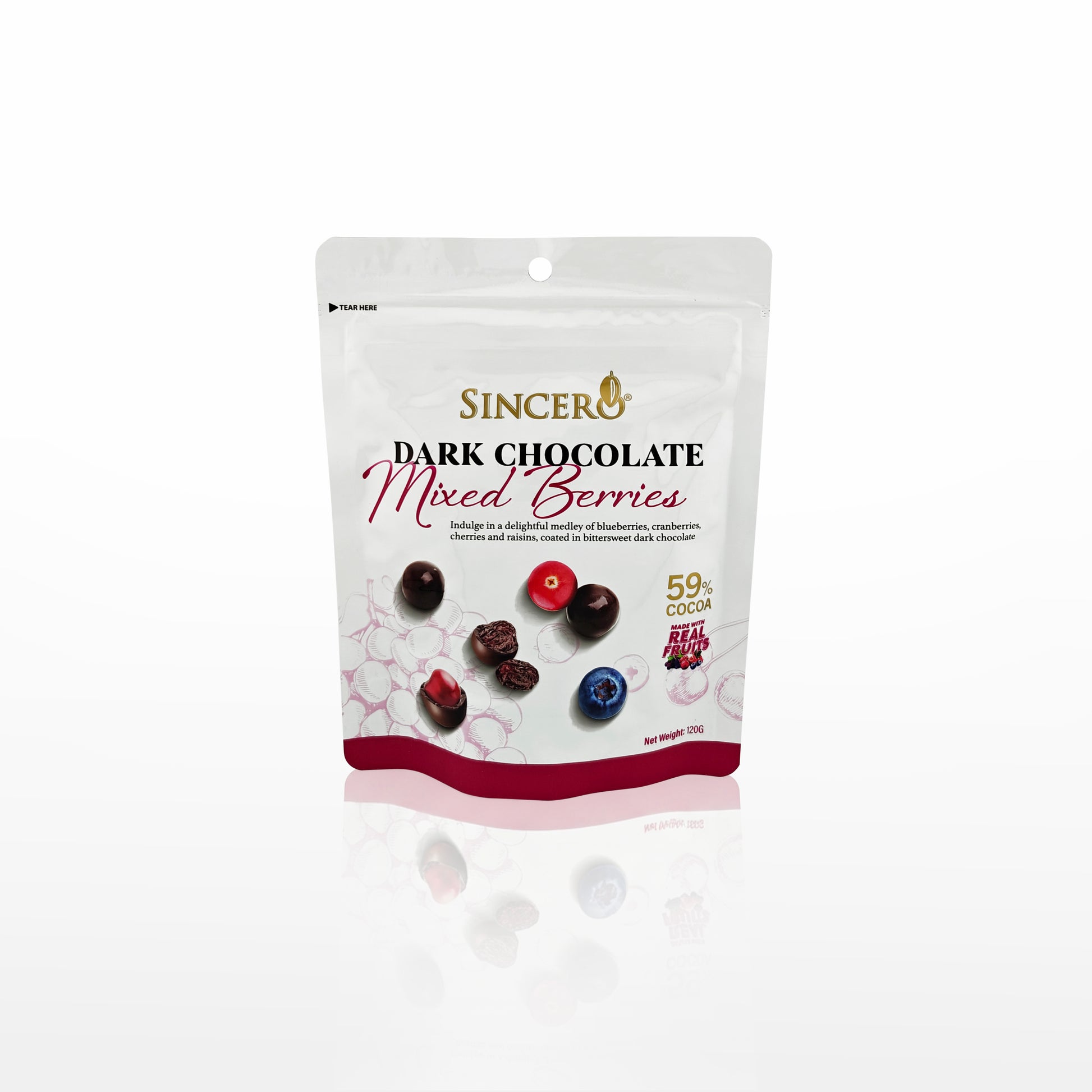 Elsker du generelt bær? Så skal du opleve den eksklusive nyhed fra Sincero, nemlig Chokolade overtrukket kirsebær, blåbær, tranebær og rosiner. Hvor mørk chokolade møder friske og naturlige smag af disse bær og rosiner. Med hele 59% ægte chokolade får du en intens, velafbalanceret og bittersød chokoladeoplevelse, hvor den dybe chokoladesmag smelter sammen med de lette syrlige og søde noter fra bær og rosiner.